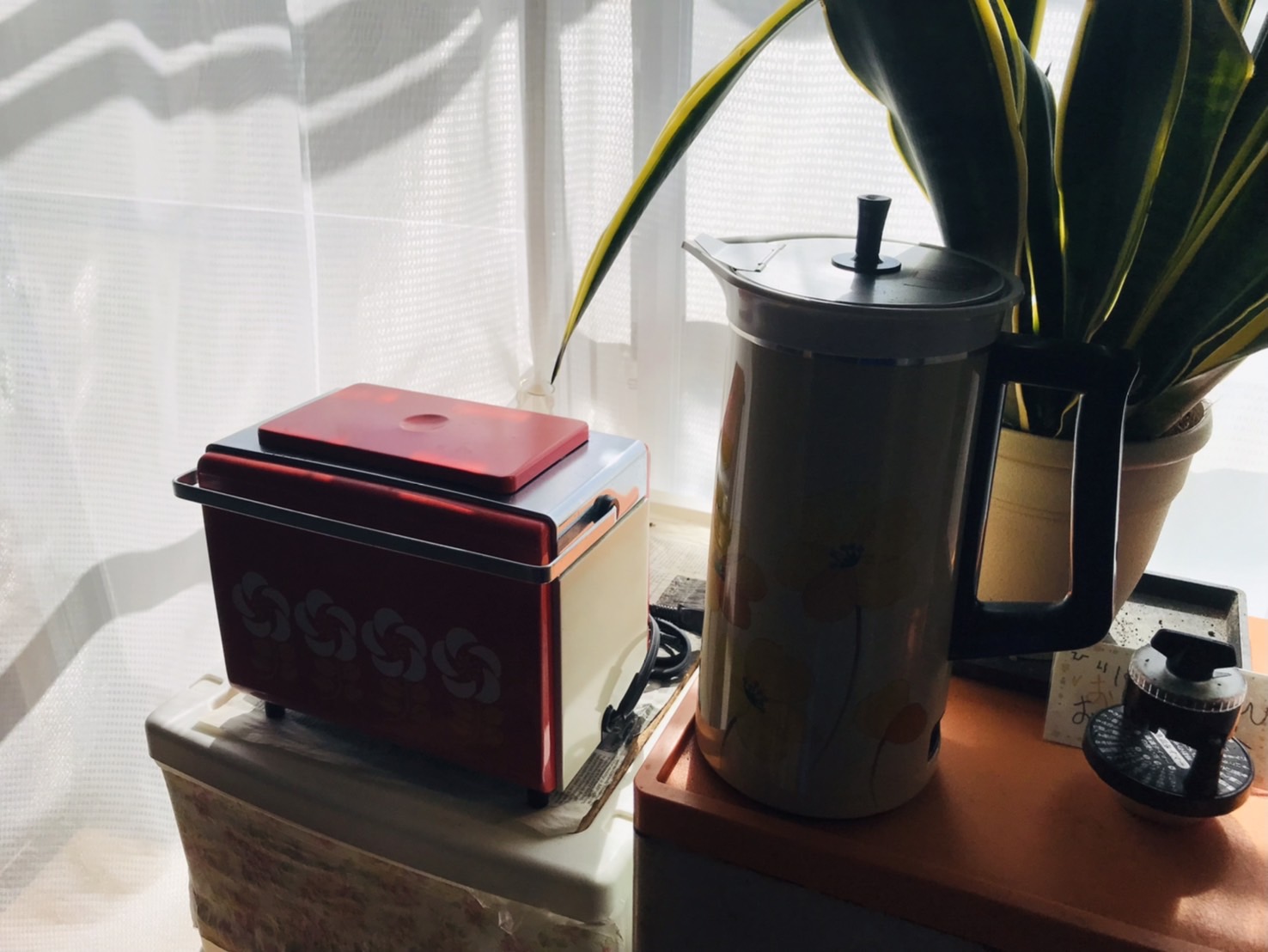 (ちなみに、赤いのは逆光で見えづらいけど昭和のトースター^^可愛いの♪お隣の黄色の昭和ポットも同じく可愛い^^)