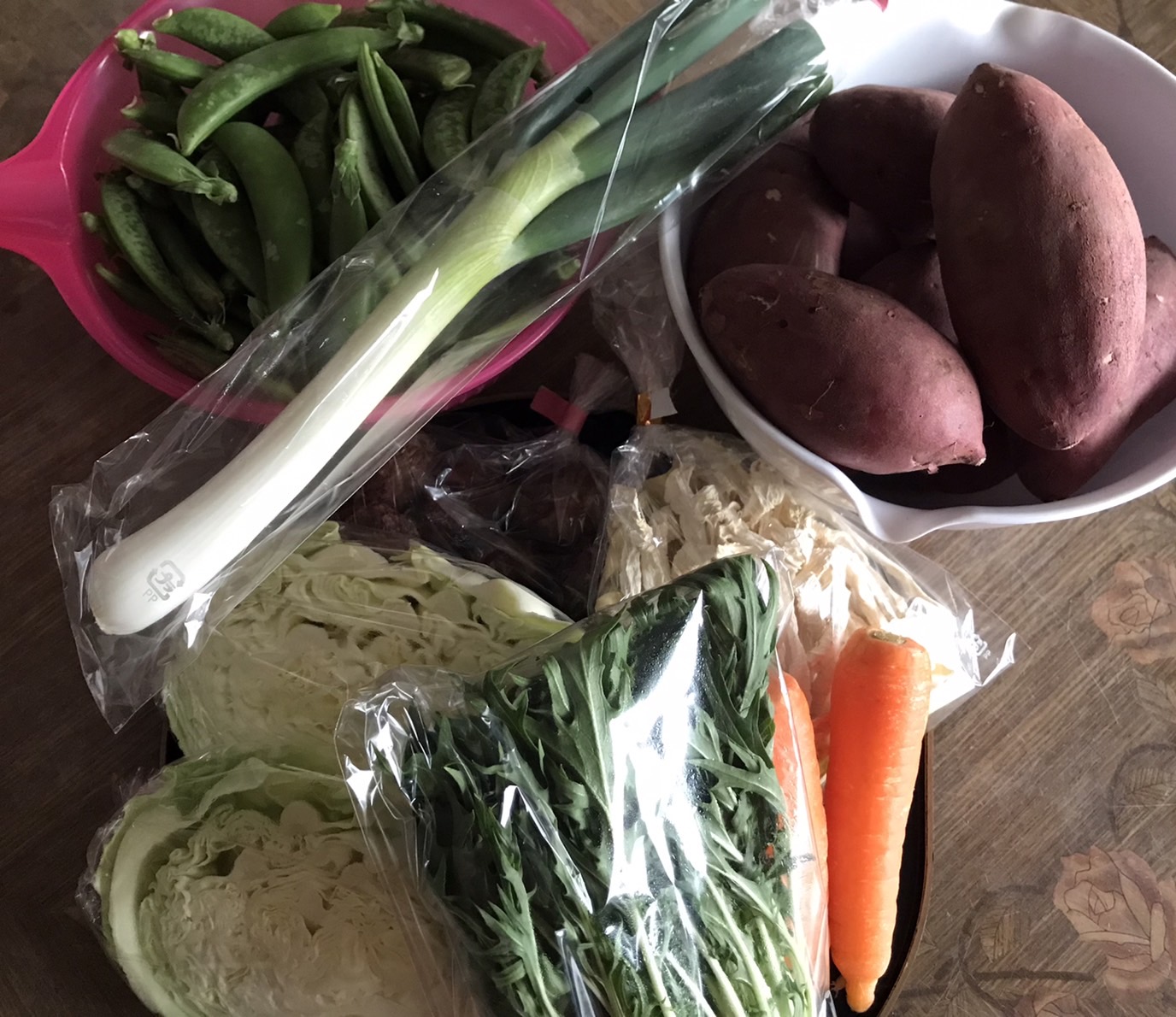 そしてスナップエンドウやさつまいも、里芋、水菜、人参、キャベツ、長ネギ、切り干し大根♪