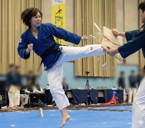具体的には、空中に設置された板を、助走をつけて飛び上がり、高い位置や遠い位置にある目標を正確な足技で破壊(板割り)する競技。